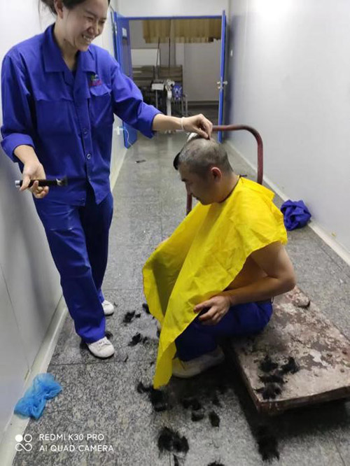 这一幕发生在11月21日公司中提车间。疫情阻击战开始至今已将近一月,为做好抗疫情保生产工作,公司采取了封闭式管理。500多名干部员工驻厂,坚守岗位,加班加点,维护了厂内良好的生产生活秩序。然而,封控近一个月,越来越多的人有了理发需求。尤其是男职工,一个个发压眉、鬓过耳,凌乱而萎靡的样子,让人看在眼里急在心里。