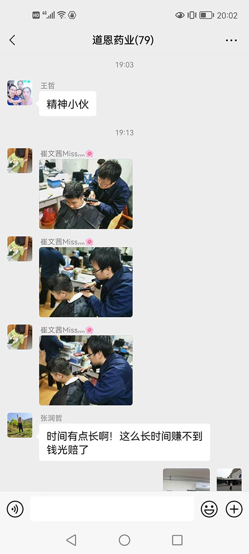 这两天道恩药业工作群里被一段段理发的视频和搞笑的评论刷屏了。视频里的“理发师”是道恩药业生产总监王学智,他拿着电动推子全神贯注为员工理发,每一下都十分认真,不放过任何一个细节;被理发的“颓废少年”秒变“精神小伙”;围观群众打趣到:“服务这么长时间却赚不到钱,光赔了。”理发现场的气氛十分融洽,隔着屏幕都能让我们感受到那份欢快。