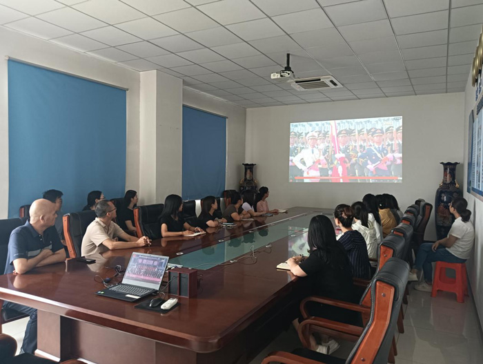 当天上午,党员们齐聚公司会议室,怀着崇敬的心情等待阅兵仪式开始。9时许,阅兵仪式正式拉开帷幕,当屏幕中出现整齐列队的受阅方队、先进精良的武器装备以及翱翔天际的空中梯队时,大家纷纷被震撼,会议室里不时传来阵阵赞叹声。