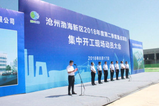 8月17日上午,沧州渤海新区2018年度第二季度重点项目集中开工现场动员大会在河北天成药业沧州渤海分公司项目现场如期举行。沧州市政府党组成员,渤海新区党工委委员,临港经济技术开发区党工委副书记、管委会主任李华峰主持大会。沧州市委常委,渤海新区党工委书记、管委会主任张国栋同志及渤海新区领导班子成员、渤海会调研员、开竣工企业主要负责人、渤海新区区级有关领导、驻区有关单位主要负责人、“一市三园”有关领导、发改局长、招商局长出席此次活动。