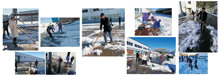 为了避免大雪对生产造成影响,车间主任吴俊川第一时间组织带领我们扫雪。大家积极地投入到铲雪行动中。虽然雪积得比就厚,天气比较冷,但这一点也没有影响我们铲雪的热情和工作放率,作为一名员工,扫雪是贵任,更是义务。洁白的积雪映照着一张张因劳动而泛红的脸庞,大家乐在其中。不一会儿,输液一车间有人出来了,储运部的人员也出来了,办公楼上后勤人员也出来扫雪了,扫雪队伍越来越大,一时间整个厂区主要干道和物流通道都是扫雪的人,形成了一道靓丽的风景线。