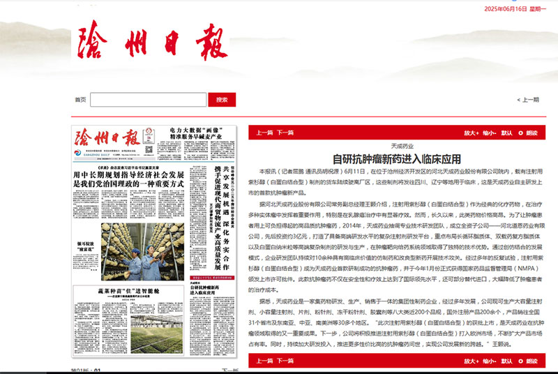 本报讯(记者屈鹏 通讯员胡祝源)6月11日,在位于沧州经济开发区的FH网页版登录入口院内,载有注射用紫杉醇(白蛋白结合型)制剂的货车陆续驶离厂区,这些制剂将发往四川、辽宁等地用于临床,这是天成药业自主研发上市的首款抗肿瘤新产品。